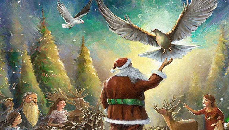 Santa releases the dove of peace among his elves to bring peace to the world!
