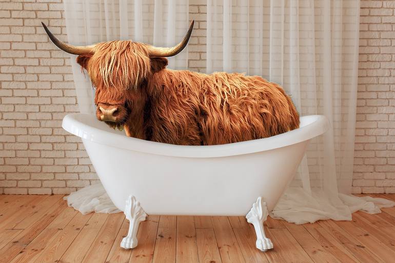 Luxury vintage bathtub on white brick background. Love Design with a head of a Highland Cow, This cow motive is an original gift idea all farmers, breeders, farmers and animal lovers with a sense of humor; who celebrate cattle, cows, calves and farm animals. an eye-catcher on the farm or agriculture...