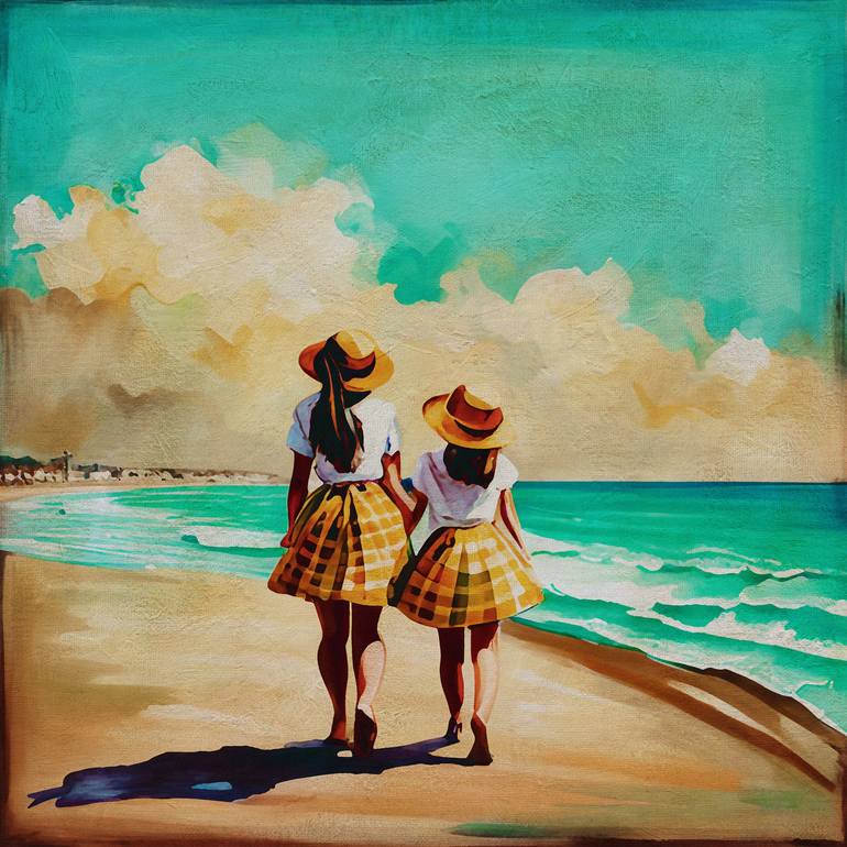We're transported to a serene beach scene, void of crowds, where the tranquil sea whispers tales of calmness and simplicity. The painting captures two girls, side by side, walking along the shoreline. Each is adorned in a dress that flutters gently with the sea breeze, encapsulating the essence of a...