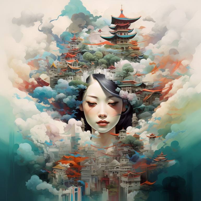 Serene Tranquility, an artwork manifested by intentional words and artificial intelligence, stands as a captivating piece within the Dreams of Taiwan collection. The artwork paints a vivid picture of a dream, where a Taiwanese woman is embraced by a serene atmosphere. Traditional buildings create a ...