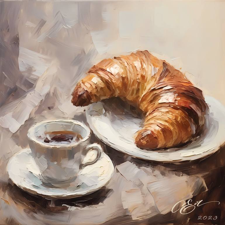 "Sicilian Morning Harmony" captures the essence of a classic Sicilian breakfast - a steaming cup of coffee paired with a fresh croissant. Using rustic impressionism and palette knife technique, warm shadows and soft lighting create a tranquil scene. This artwork adds elegance to any space, celebrati...