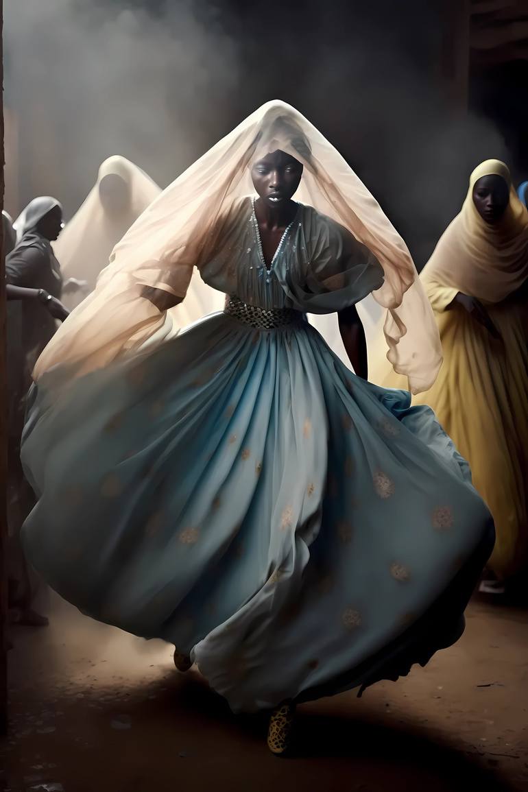 "Silent Tears of a Child Bride" is a powerful artwork that shines a light on the harrowing reality of forced marriages among young girls. The central figure, a very young black woman, is shown in a vaporous blue dress and a white veil on her head, walking with a sad expression and her gaze fixed on ...