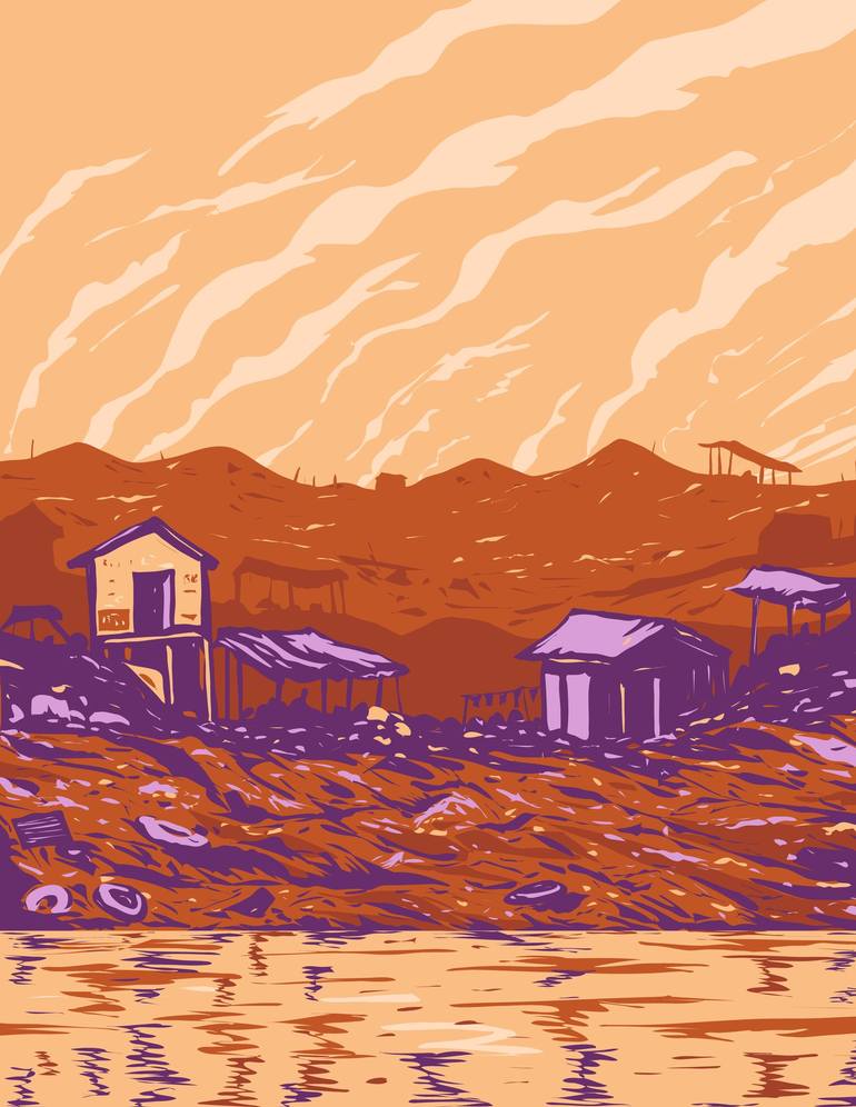 WPA poster art of Smokey Mountain slum area in the 1980s, a landfill or dumpsite in Tondo, Metro Manila, Philippines with squatters and decomposing wastes done in works project administration style.