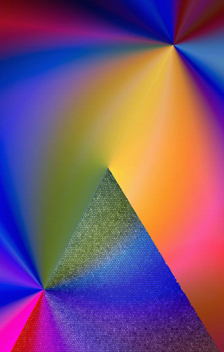 This artwork radiates with luminous energy, where geometry and spectrum converge into a vibrant, kaleidoscopic vision. The triangular form anchors the composition, refracting bursts of radiant hues like light through glass, while gradients ripple outward in waves of color and motion. Created with n...