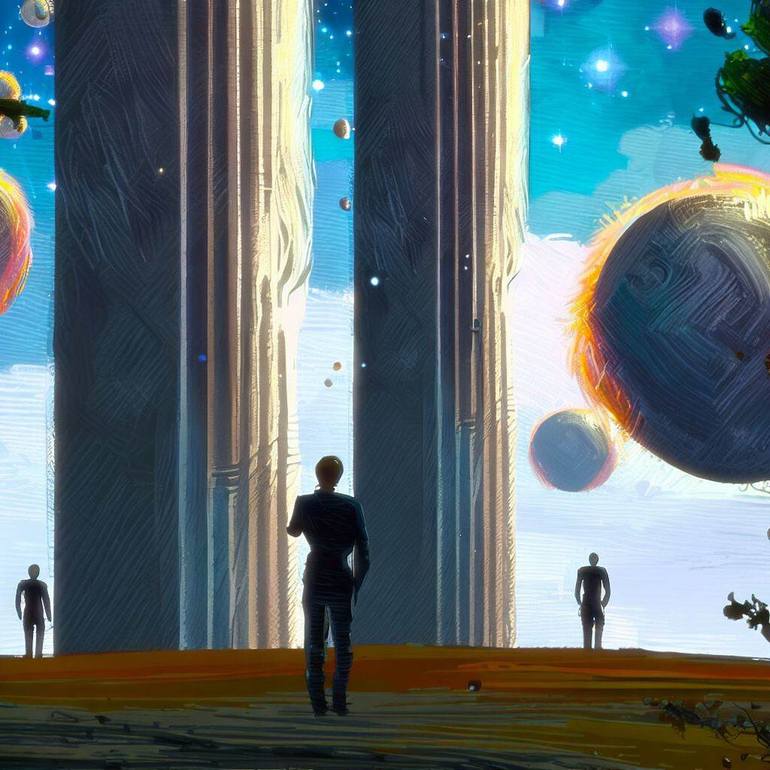In this celestial theatre, the figures serve as silent narrators to an unfolding cosmic saga. The vertical columns are the timeless scrolls of the universe, inscribed with the stories of millennia, reaching from the earth to the expanse of the heavens. They stand as metaphors for knowledge, history,...