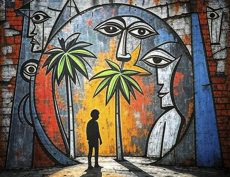 A mural displays abstract faces alongside green palm-like trees. A child's silhouette is seen in front, creating a dramatic effect.