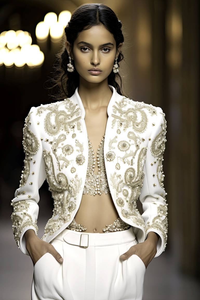 The painting depicts a refined young woman with sleek, dark hair elegantly swept back, accentuating her classic beauty. She is dressed in an exquisite white ensemble, featuring a short jacket delicately hand-embroidered with pearls. The combination of clean lines and luxurious detailing strikes a pe...