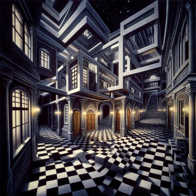 A complex, surreal scene with impossible architecture and a checkerboard floor. Intricate structures and staircases create an illusionary space.