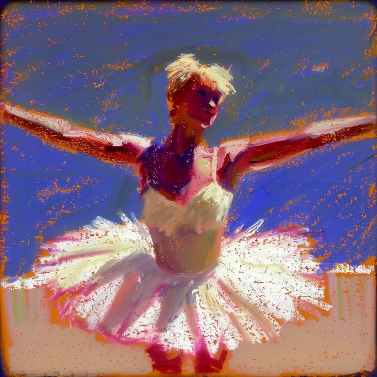 Ballet series. Inspired by the grace of ballet dancers, this work captures the elegance of a dancer's legs and pointe shoes. It evokes the passion and beauty of the dance. The rich colors and texture of the oil pastel technique complement the modern, impressionistic style.