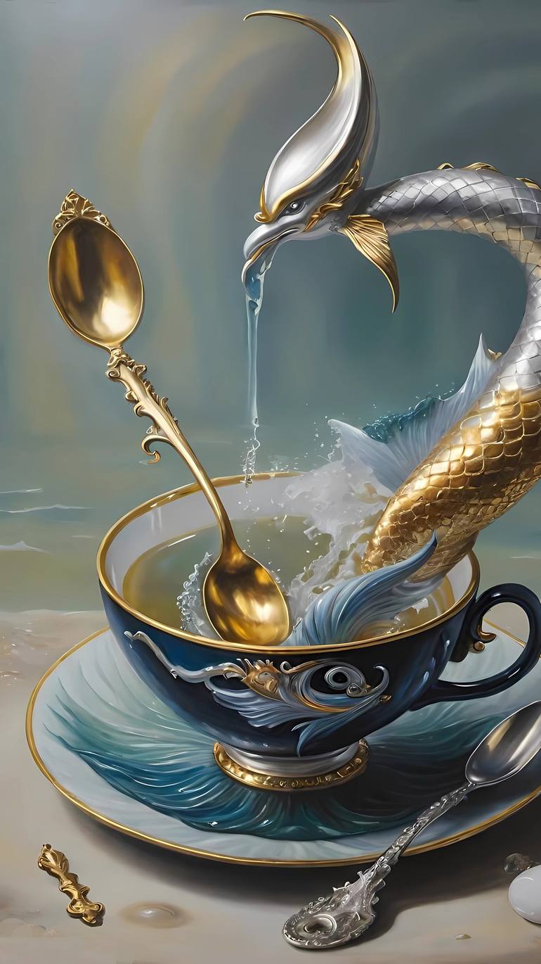 Finest porcelain mug, inspired by the timeless luxury of the world's most prestigious hotels.distinction. Beside it, a mythological mermaid—a fusion of siren and sphinx—emerges serenely, like a guardian of refinement. This piece symbolizes the intersection of earthly elegance and eternal fantasy. Id...