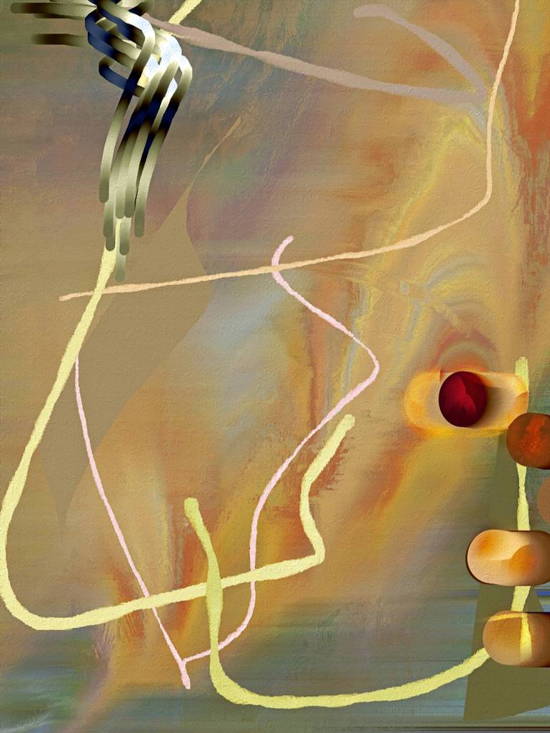 Abstract digital painting, contemporary, expressionistic. In front of a subtly colored background, the work puts in opposition to each other two energy centers, one in the upper left and one at the lower right. Both give rise to lines that intersect and are accompanied by other, self-seeded lines. R...