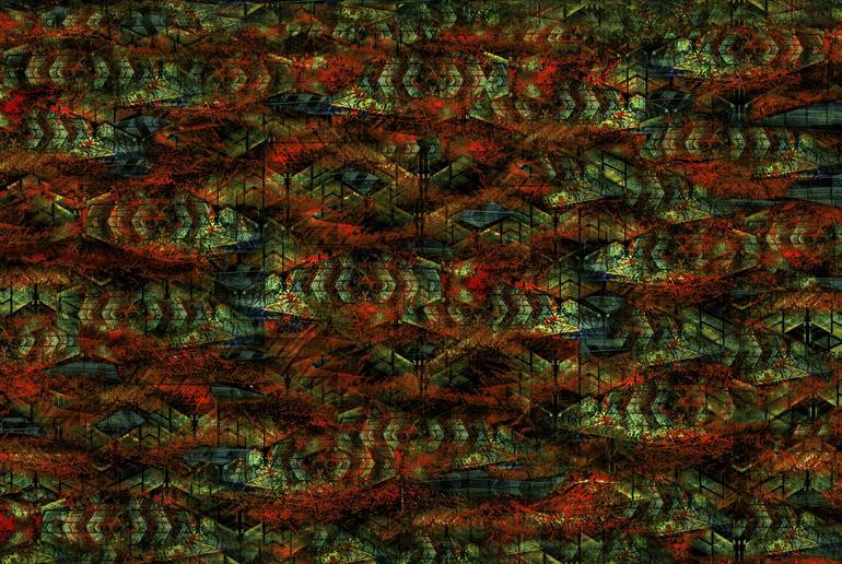 We sea a great spawning of what appears to be fish teaming in an ocean of what in fact is a radically abstract bed of abstract marks anchored to a strange grid. It is in fact a collage from 'simple' street photographs by means of an original method which runs through my work- that it is made by cop...