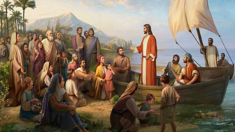 This painting is inspired by the account of Jesus preaching by the Lake of Gennesaret. Pressed by the crowd, He stepped into a small boat, moved a little from shore, and taught the people. Clothed in a red robe, He stands with open arms, His gaze gentle yet filled with authority. The boat rests on c...