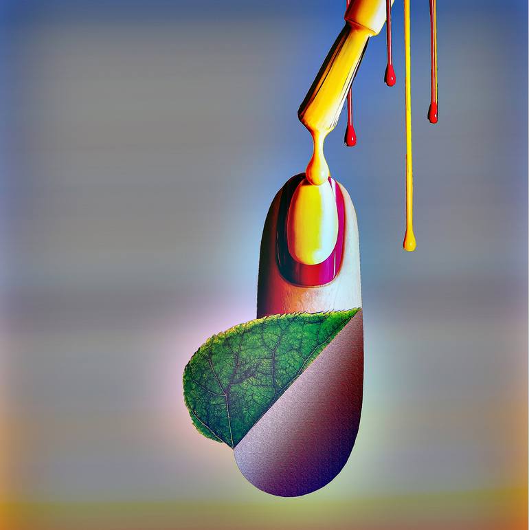 The Manicured Leaf – 6078 presents a striking visual metaphor where self-care meets environmental commentary. A vibrant nail polish dropper hovers above a stylized fingernail half synthetic gloss, half living leaf suggesting both beauty and manipulation. With its glossy textures and surreal compos...