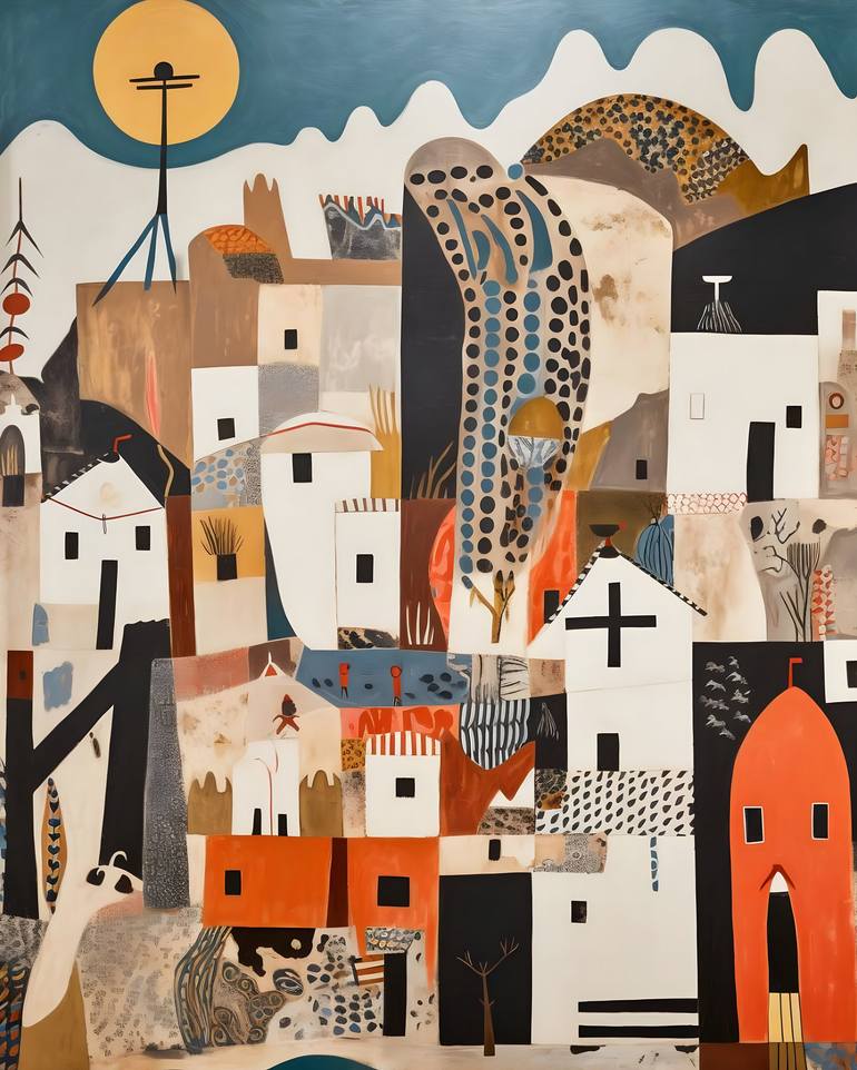 This piece encapsulates a vivid narrative steeped in layers of diverse influences, reminiscent of a village nestled amidst the enchanting fusion of a rural village and Manhattan’s cultural tapestry. Drawing inspiration from Ephraim Moses Lilien's evocative style, this piece harmonizes figurative and...