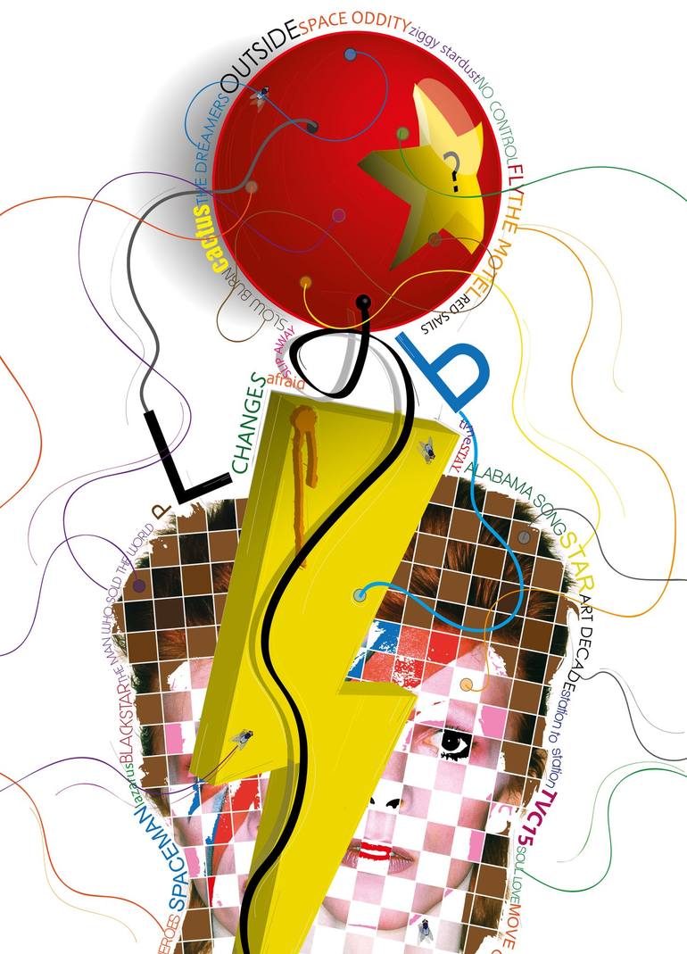 This artwork is a tribute to David Bowie, depicting how a thunderbolt (his symbol) splits him in half and all that he was goes with him into another unknown world.