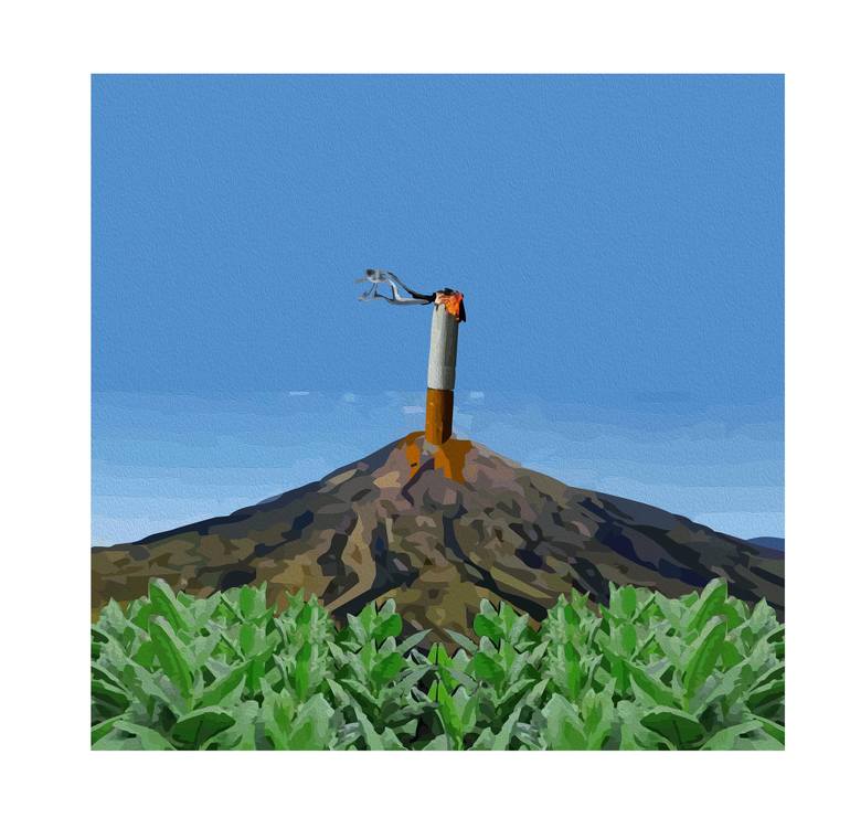 Surrealist painting full of irony depicting inequality and contradictions in the tobacco industry. At the top of a towering mountain, a lit kretek cigarette is stuck like a crown, the smoke rises high, symbolizing the huge profits of factory owners and middlemen. At the foot of the mountain, lush gr...