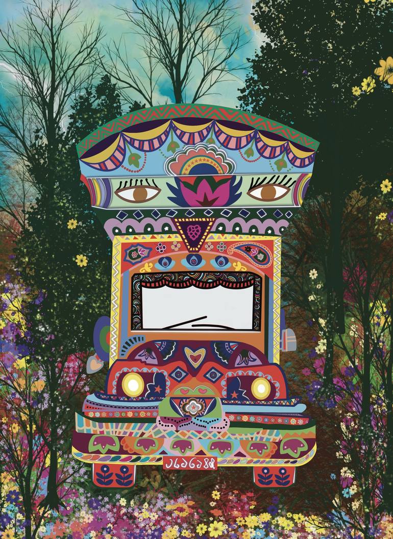 Discover the enchanting beauty of nature with a vibrant twist in this captivating digital painting. Titled "Tranquil Truck in Bloom," this artwork seamlessly blends the cultural richness of traditional truck art with the serene and picturesque scenery of a forest in full bloom. A vividly designed tr...
