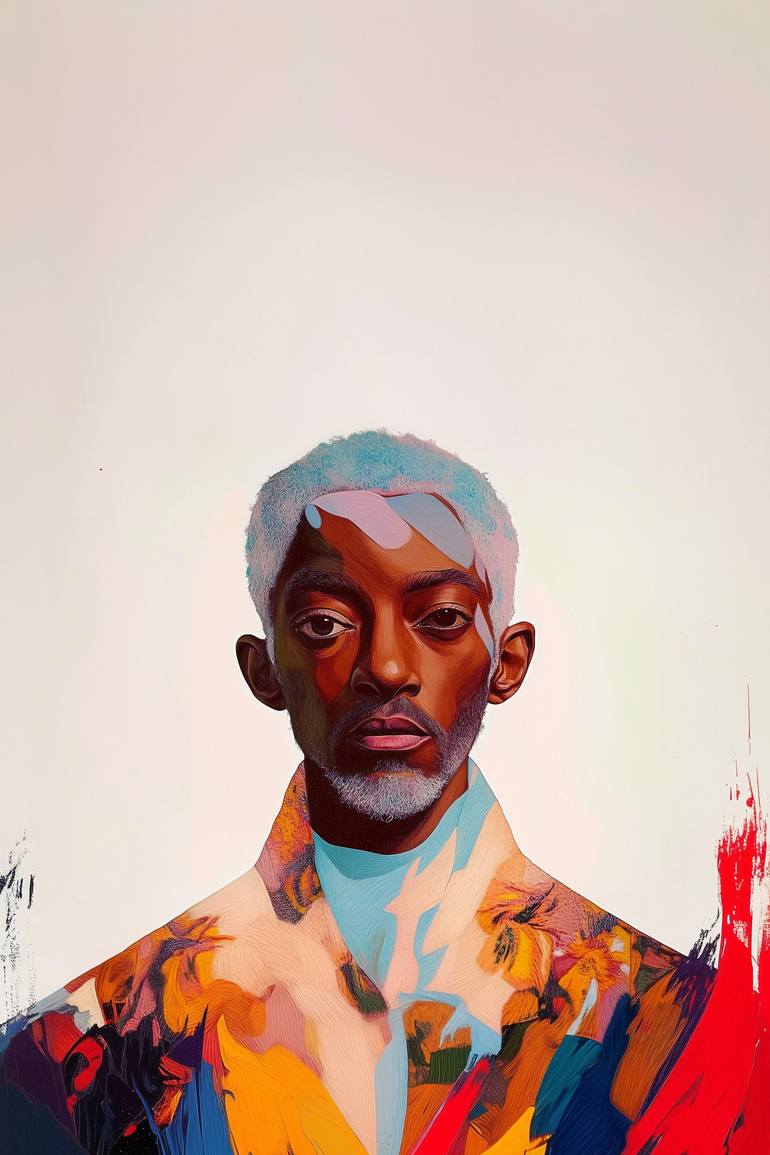 This stunning portrait combines realism with abstract expressionism, presenting a bold and vibrant exploration of identity and individuality. The subject’s poised gaze and lifelike features are complemented by dynamic bursts of color and fluid patterns that cascade across his form. The composition’...