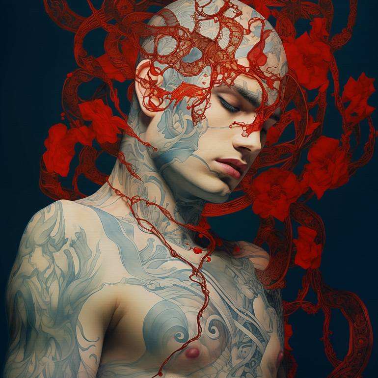 The compelling piece titled 'Vinny | Nightmares' delves into the complex interplay between beauty and the subconscious. It portrays a person, Vinny, in profile, their expression one of introspective stillness, as though they are confronting an unseen turmoil within. A striking headdress of vivid red...