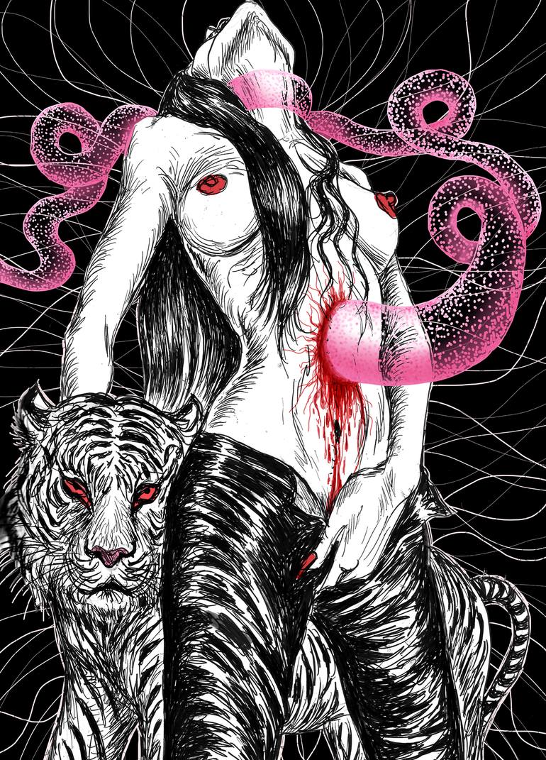 In my work I'm exploring themes like identity, sex, gender, feminism issues, as well as myths, religion, mythological and psychological archetypes, psychology, various emotional and mental states, and subconscious in general, mixing socially and politically more relevant issues with intimate narratives, self-analysis and introspection. I always draw from the principle of dark feminity, celebrating and channeling dangerous and seductive goddesses of night, magic, chaos metamorphosis and otherworldly realms, female demons and nocturnal, oceanic or subterranean mythological creatures, together with film noir (anti)heroines, which are all also present in my poetry. The most visible and tangible element in my work is eternal obsession with sex, death, fetishes and taboos. I am traveling to those dark and disturbing realms of human psyche and experience, challenging fantasies and borders of identities and experiences. In that investigation, I am diving into the oceans of Id to emerge with hybrid creatures that represent different facets of myself and I am trying to tame the demons inside, that omnipresent shadow that constructs the dark, unsettling and eerie part of everyone's self. And doing so, i prefer bold, dramatic and more raw expression. But, when I deal with drawing medium, I engage in different styles, according to my momentary feeling: from intricate and detailed work that borders with visual stream of consciousness and hermetism, to clear, distinct, illustrative, descriptive and explicit stuff. Thematically, women and female creatures are the most present actors in my work, representing martyrs, queens, explorers, otherworldly entities, victims and conquerors of their fate and specific life journey. I am obsessed with possibilities of transformation and reinvention of self and with polarity between male and female principle and energy, which sometimes leads to representations of sadomasochism, and sometimes to merging of opposites in spiritual androginy, but those sexual, gender and social identities always dance on the edge of established normatives. So, I'm fascinated with dramatic contradictions of psyche, and I examine the tango of Eros and Thanatos, as well the relation of vulnerability vs. brutality, ethereal vs. carnal, angelic vs. diabolic. Little monsterish caprices and impulses are driving force of my work, creating macabre scenes with elements of uncanny.