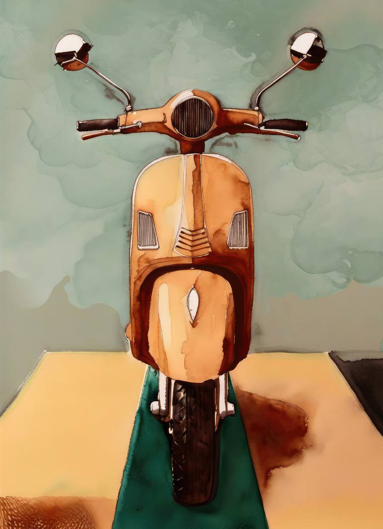 Watercolor hand painted scooter illustration isolated on a green background. Vintage motorbike