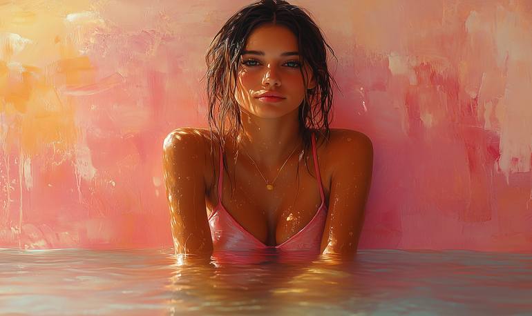 A woman stands in a pool, her hair wet and skin glistening under warm lighting. The background features soft, blended hues of pink and orange, creating a serene atmosphere.