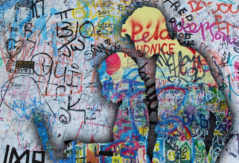 Bright graffiti covers a wall, with the silhouette of two individuals interacting cut out and filled with more vibrant artwork. Various texts, symbols, and colors make the graffiti lively and chaotic.