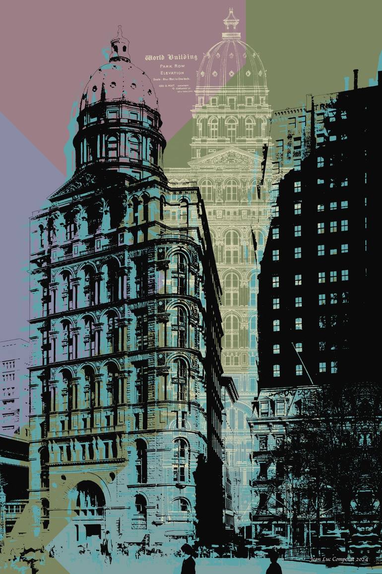 World-Pulitzer Building building giclee print - Pop Art Warhol style. Collage - building's blueprints and pictures. Original: giclee on canvas hand signed, numbered and dated - 24" x 36" with 2" extra border - rolled / shipped in tube. Prints - photo paper, fine art paper, canvas acrylic, woo...