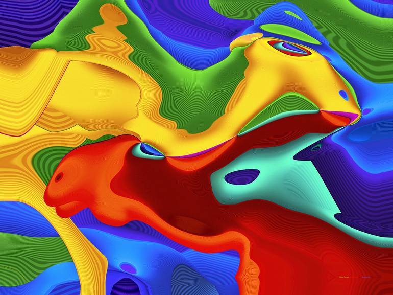 The picture is made in the style of Color Flow. Although a different color volume - yellow, red or blue, represents each animal - still, these color forms are in a proportional balance. Smooth lines evoke a state of peace and harmony. The colors are not monochrome; they contain darkened undulating p...