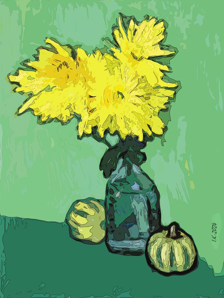 Ivan Kolisnyk,1961, Ukraine. 'Yellow Chrysanthemums Against Green Background (f1)' is image created with digital filter after my original painting 'Yellow Chrysanthemums Against Green Background'. 4725 x 3544 pixels size. Original painting by 40x30 cm was created in 2021