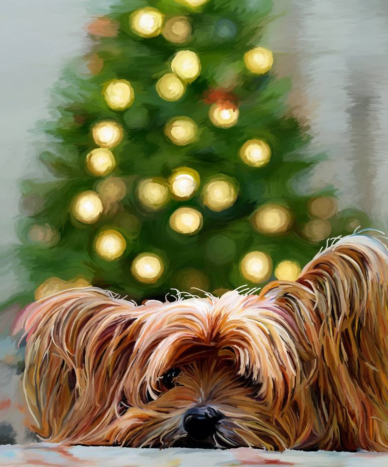 Add a touch of holiday cheer to your decor with this charming hand-painted digital portrait of a Yorkshire Terrier lying in front of a beautifully decorated Christmas tree This festive art piece captures the Yorkie’s sweet expression, bringing warmth and joy to any space. All my pieces start as han...