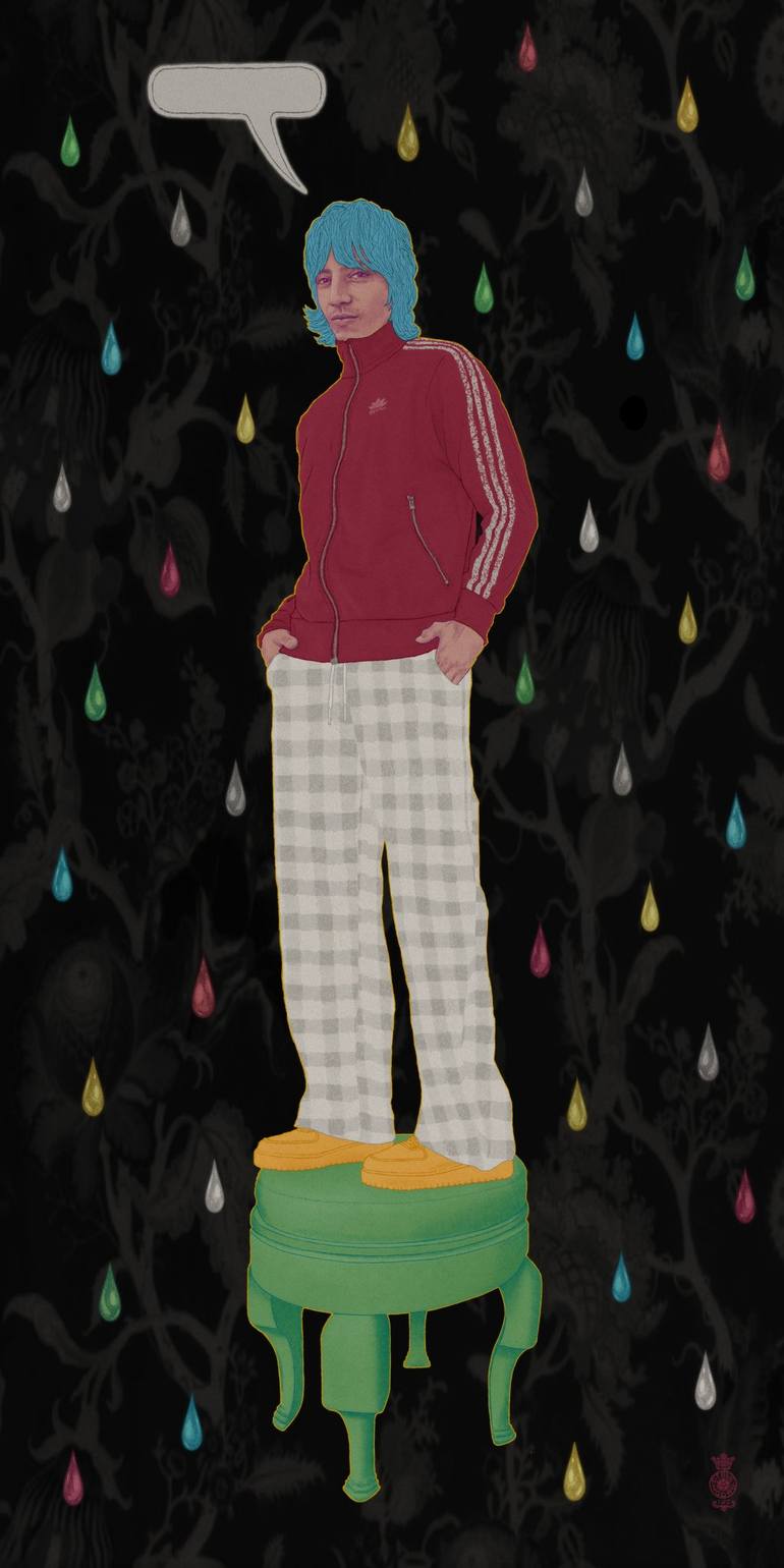 The image portrays a young man standing on a green stool. He has blue hair and is wearing checkered pajama pants and a vintage red Adidas zipped sweatshirt. The prints are made on high quality fine art paper. The print is invisibly bonded behind a panel of museum grade acrylic glass, in a process ...