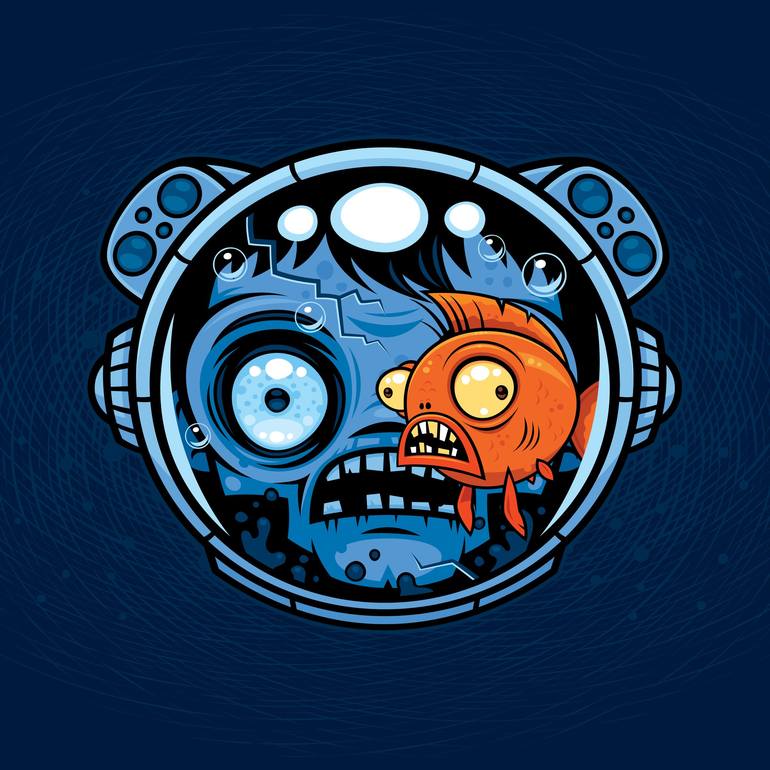 A zombified astronaut face peers through a circular helmet window with a startled expression, accompanied by an equally shocked orange fish who thinks he is in a fishbowl. The scene is depicted in a bold, cartoonish style with vibrant blue and orange hues. Tags: zombie, astronaut, helmet, fish, cart...