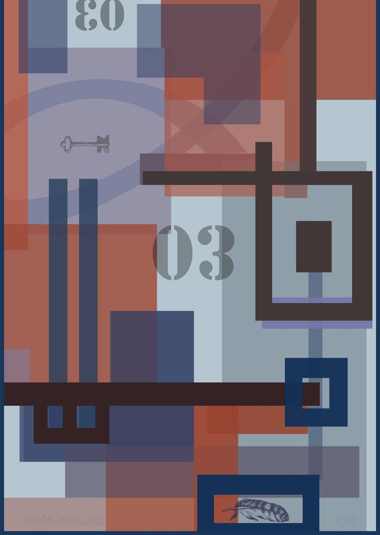 "cero tres vi-gital" is a captivating digital artwork printed on paper that invites the viewer into a world of surreal concepts and modern design. The artist, Ojolo, blends typography with symbolic imagery, featuring a zero, the number three, an eye, a lock, a feather, and a key. The piece is a test...