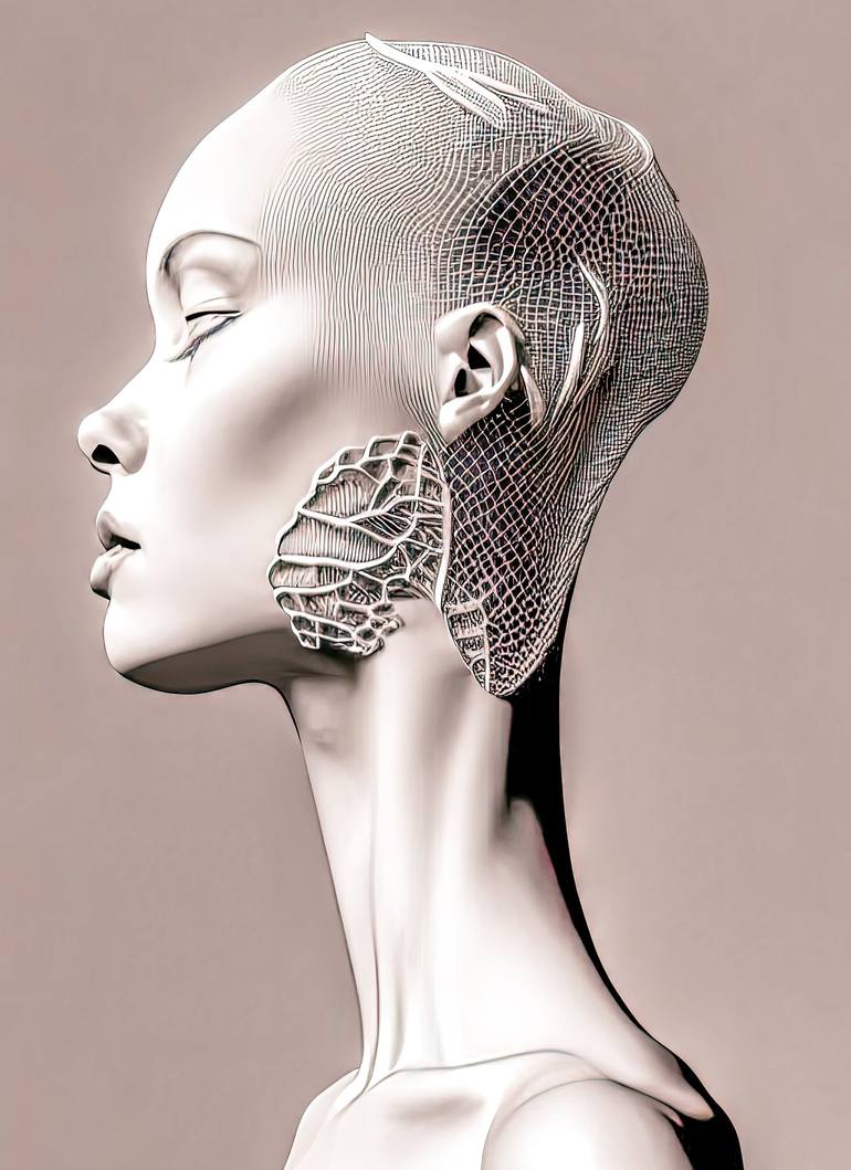mythical dreamy black and white organic translucent bio-mechanical spinal ribbed profile face portrait detail of mechanical beautiful female steampunk ornate digital art