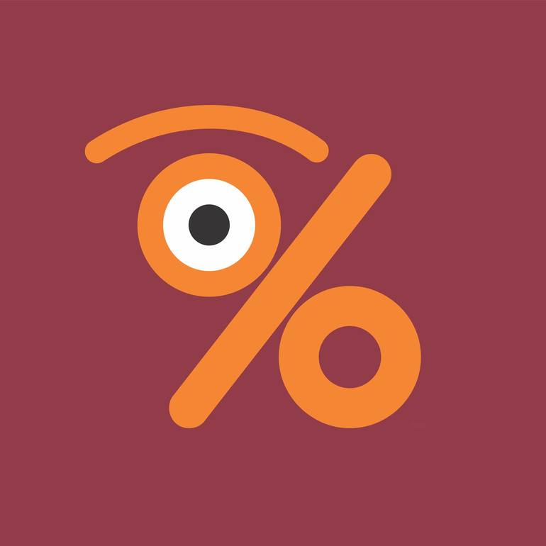 This witty minimalist artwork transforms the humble percentage symbol into an expressive, watchful character. Rendered in bold orange against a warm rose-burgundy gradient background, the "%" sign gains personality through the clever addition of a white eye with dark pupil in its upper circle, compl...