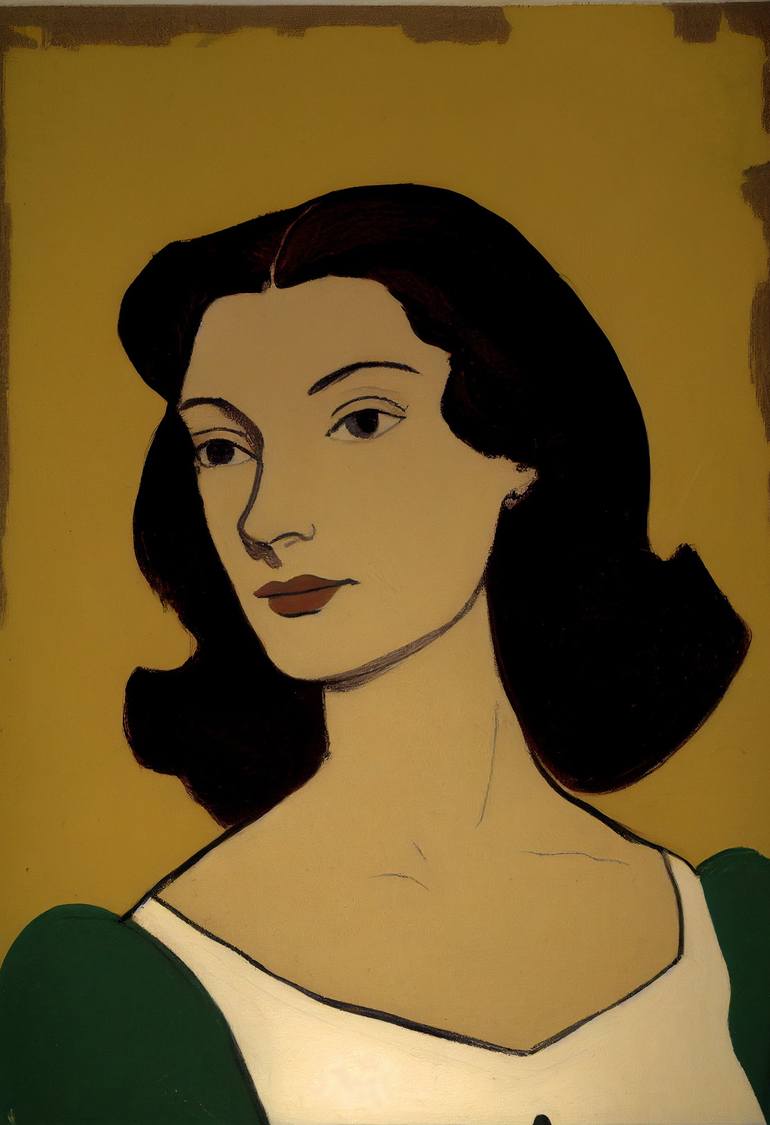 A simple, modern and contemporary portrait of a brunette woman, lost in her thoughts, wearing a white and green dress. A classic example of my usual simplified American Modern + storybook illustration + minimalist folk style, that captures a sense of portraits from the 1940s and 1950s. The work uses...