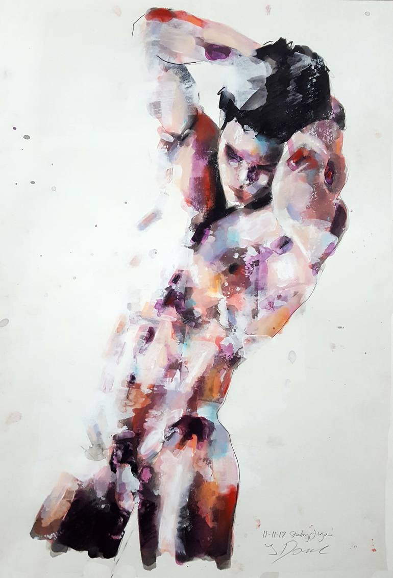 A medium scale drawing depicting a standing male figure in inks, Acrylic and charcoal on 200gms paper. The ongoing series of figure drawings examines the genres of representation and expression and have been influenced by the work of Bacon, Schiele and the illustrator Ralph Steadman. The use of flu...