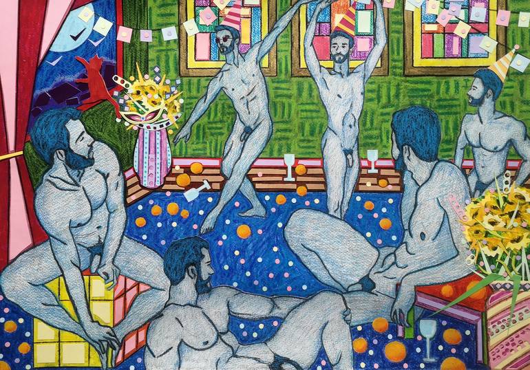 This is a lively and dynamic scene filled with energy and joy. The picrute bursts with bright colors, creating an atmosphere that feels both celebratory and euphoric. Naked men are depicted dancing exuberantly, their bodies in various poses that capture the movement and rhythm of the moment. Each f...