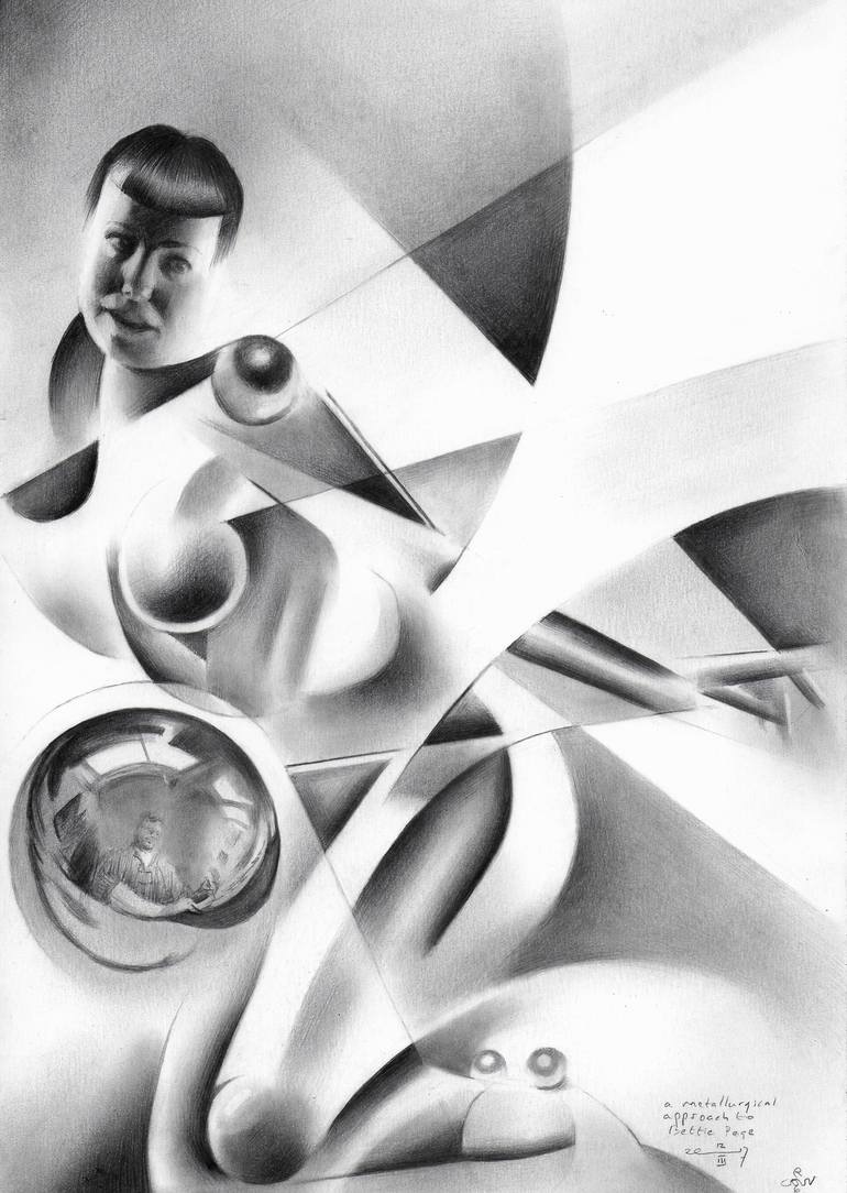 Finally it was to time to capture Bettie Page in a metallurgical and cubistic way. Graphite pencil drawing (Pentel 0.5 mm, 3B) on Canson Bristol paper (21 x 29.7 x 0.01 cm - A4 format)