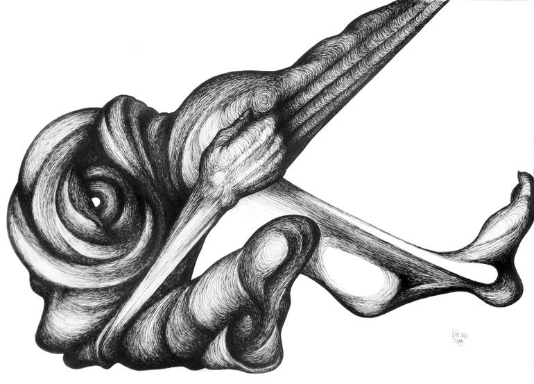Born in 1964, Red Tweny is no stranger to high expectations and personal tragedy. As the first of two children, his childhood was restricted by an overprotective mother who perhaps imprinted the sense of insecurity and estrangement from reality which has so often factored into both his life and his work. His artistic talent was revealed at an early age. In an attempt to foster Red’s abilities, his mother made it a point to religiously attend all of the contemporary art exhibitions that passed through Rome during the mid-1970’s. By age 12 he was also studying under the tutelage of an illustrator at the local college he would later graduate from. At age 20, personal tragedy struck with the untimely passing of his father, who Red, himself, found lifeless. This event deeply marked his psyche and has impacted the style and subjects of his artwork ever since. He graduated in 1984 from the Mary Mount College in Rome. The institution’s pedagogic method, characterized by a humanistic philosophy on religion, gave a prominent role to the spiritual nourishment of his creativity. Since then he’s been actively attending exhibitions all around Rome in the search for new subjects. In 1985, his artistic talent landed him a job in the advertising department of Eni, an Italian energy company, where he remained throughout the 90s. This position allowed him the opportunity to collaborate with several large international agencies, which influenced his own work; combining elements of classical, surreal painting with graphical design. He primarily made the use of watercolours throughout this period but switched to black ink in 2000, which made his work instantly recognizable. Tweny’s work is now characterized by an exaggerated use of black ink and his subject matter leaves vivid impressions with his audiences. He does not make use of subtext, but rather overtly throws the essence of his work in the forefront for all to see. This work centers around the lovely futility of attempting to find meaning in a tangled existence. He frequently depicts subjects experiencing extreme emotions, which he likens to capturing the expressions of someone going through un-anesthetized surgery. The use of only black and white is used to heighten the feeling of violence, coldness, and desolation in the human condition.