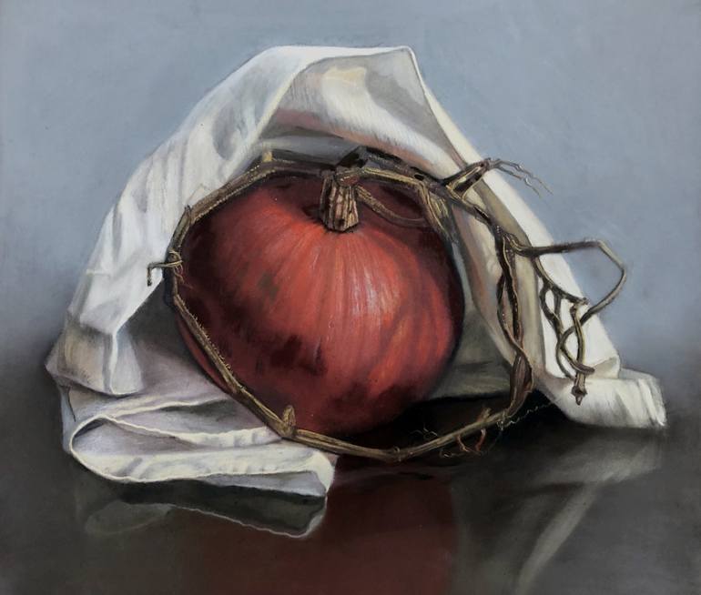 A still life with a pumpkin in a white cloth. Daniel Solnon, trompe-l'oeil painter and pastellist