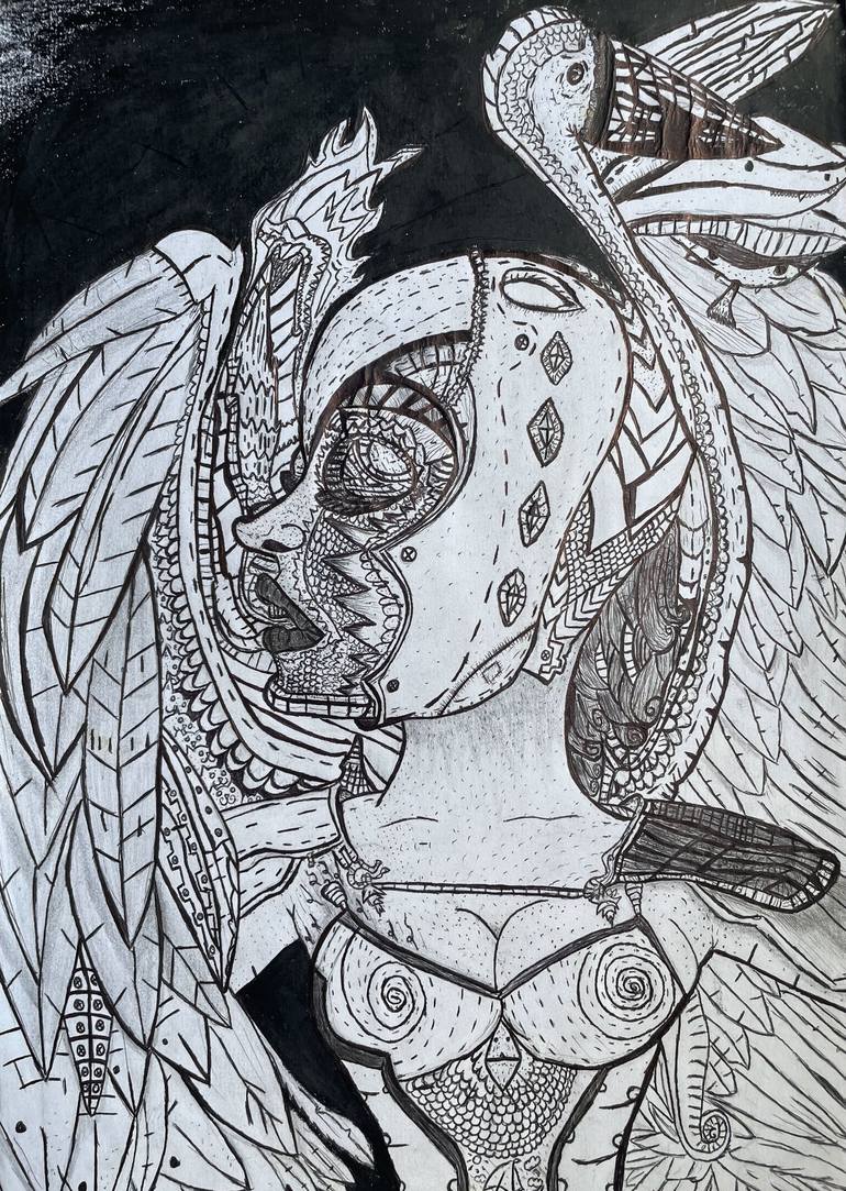 The Angel of Destruction. He carries the death of the oceans on his wing. There are several hidden animals within his wing. His mask symbolizes the simplicity of the essential, empty spaces without jewels. In his bosom lies the gaze of the owl. It’s an excellent drawing for you to print and paint ...