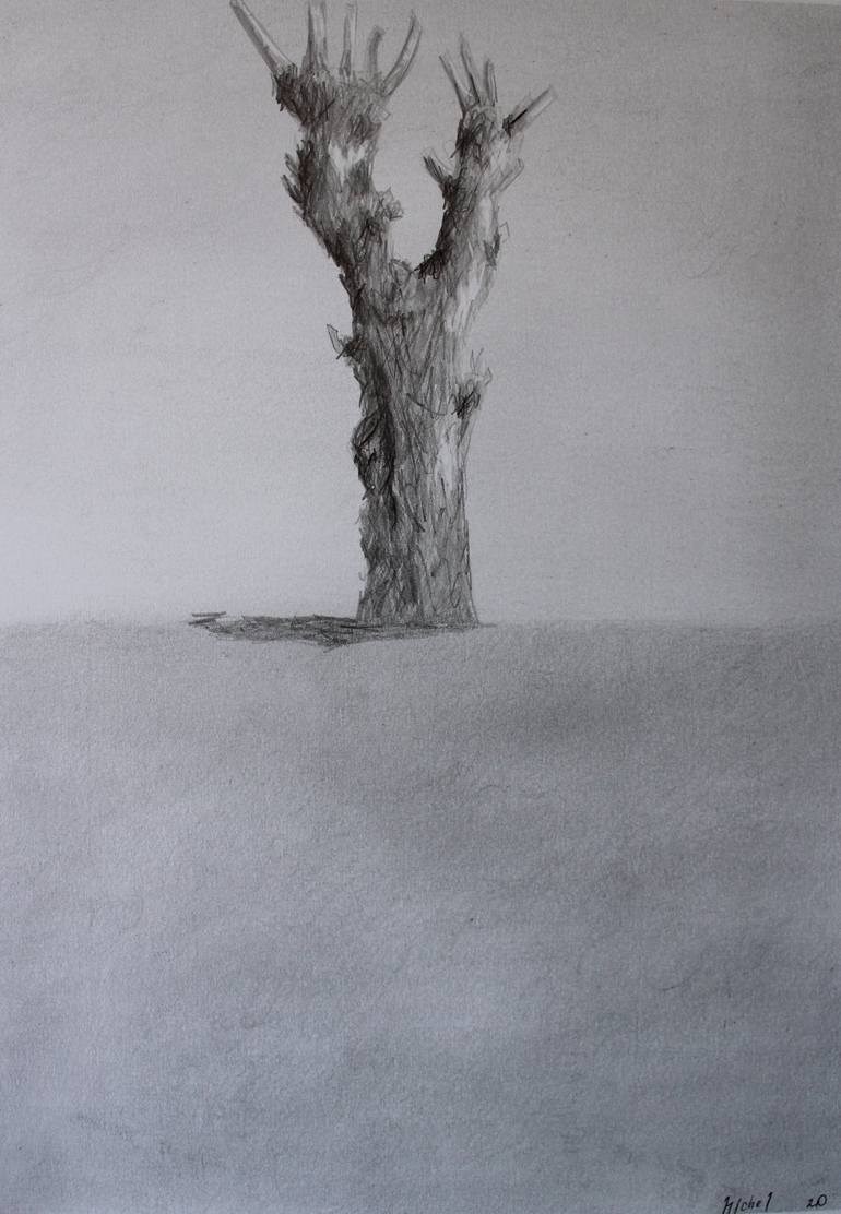 Es un dibujo de un árbol que se cruza en mi camino, un árbol maltratado por los podadores municipales, un árbol desplazado por los postes del cableado publico. Dibujo sobre papel.