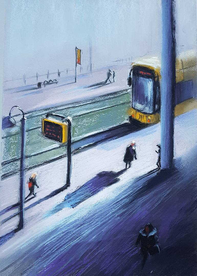 Daily life scene in a city. I've been fascinated by the bright sunlight and deep long shadows it created. Although, there's movement in the picture, it feels kind of frozen. This artwork was created in the times of covid restrictions and this is how it felt. That life somehow stopped and kept silent...