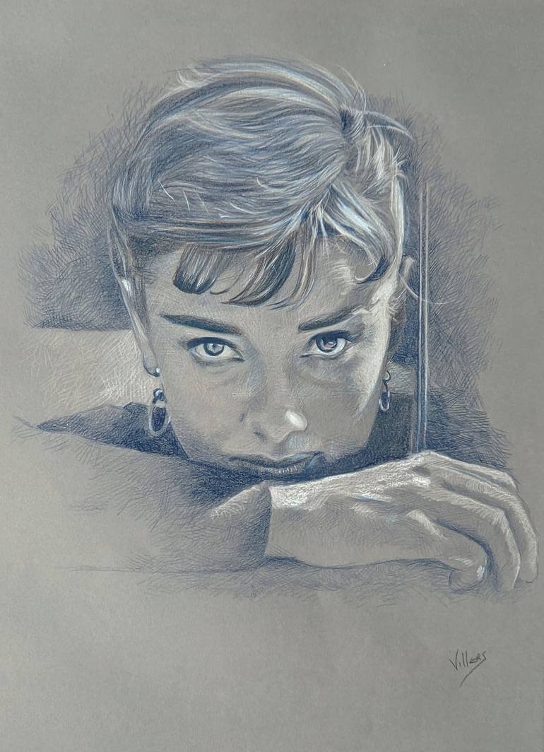 Portrait de Audrey Hepburn, incarnation du charme et de l'élégance, aux crayons prismacolor couleur indigo, blanc et gris chaud sur papier canson gris. Le bleu ajoute une plus-value à la profondeur du regard et attenue le caractère introvertie de la star. Portrait of Audrey Hepburn, the embodiment...