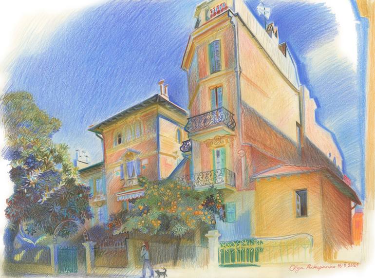 This colored pencil drawing captures a serene moment on Avenue Durante in Nice, France.This is the classic European architecture of the buildings, adorned with balconies and a variety of windows. The lush greenery surrounding the buildings adds a touch of natural beauty to the urban environment, cre...