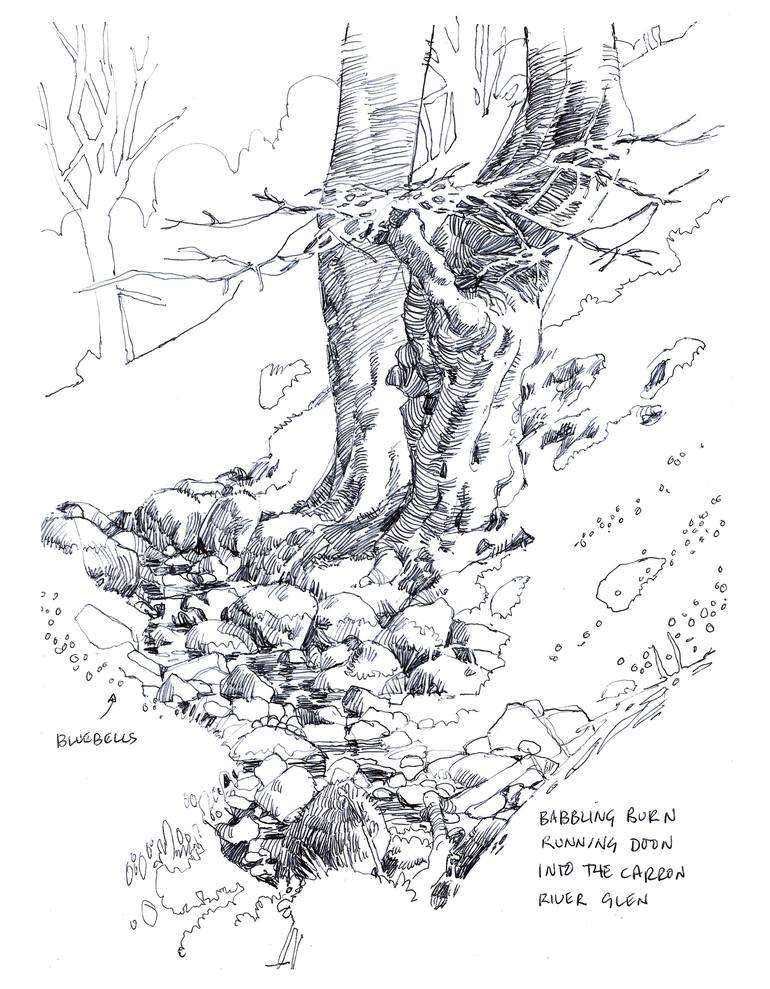 Sketched live in the warm May sunshine in one the wooded slopes of the Carron River valley. Sketch is in ballpoint on Watson and Guptill paper.