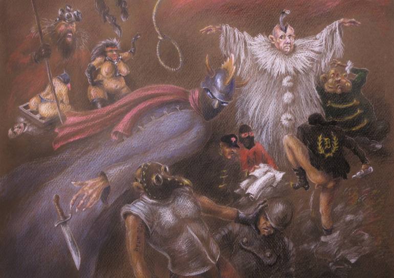 A surreal scene depicts various fantastical characters in dramatic poses, including figures with masks and elaborate costumes. Unsavory characters dance in bacchanalia, threatening to draw viewers into their feverish dance.